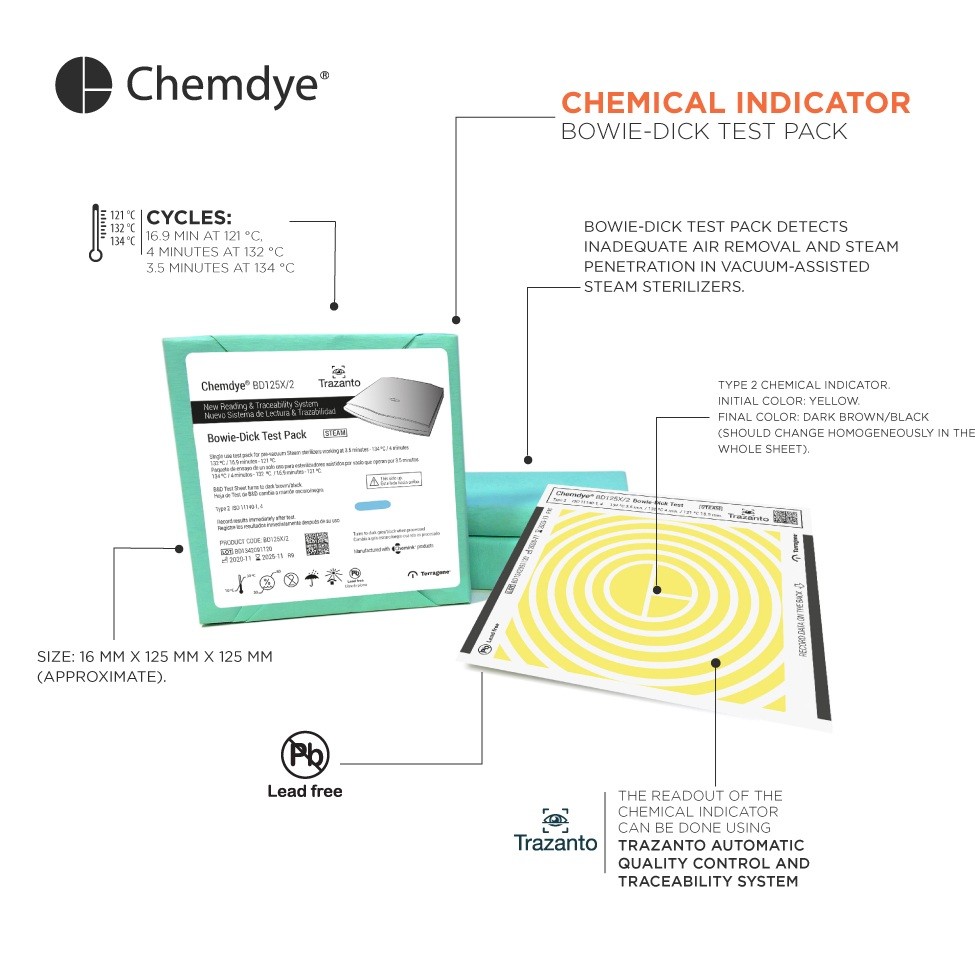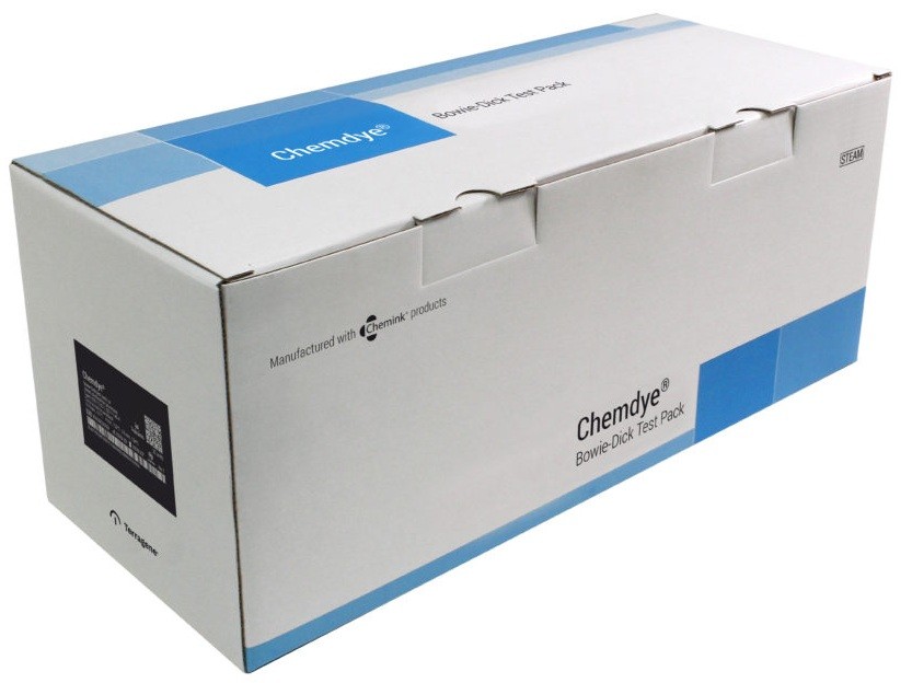 Il test pack Bowie-Dick rileva una rimozione dell'aria inadeguata e la penetrazione del vapore negli sterilizzatori a vapore assistiti dal vuoto. Cicli di 16.9 min a 121 ° C, 4 minuti a 132 ° C e 3.5 minuti a 134 ° C.